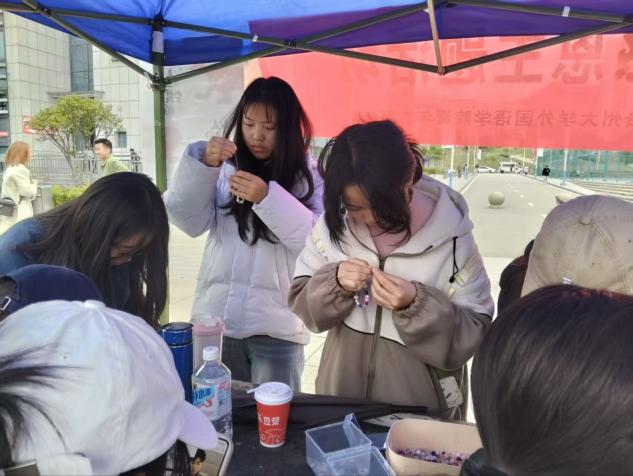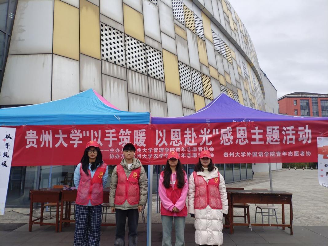 团委网站讯(记者李赟赟报道 | 摄影农学院青协)为引导师生牢记嘱托、感恩奋进,传递校园温情,2025年11月22日,贵州大学农学院青年志愿者协会联合管理学院青年志愿者协会、外国语学院青年志愿者协会主办“以手筑暖,以恩赴光”感恩系列活动,活动在北校区、南校区、西校区同步开展,吸引师生广泛参与。