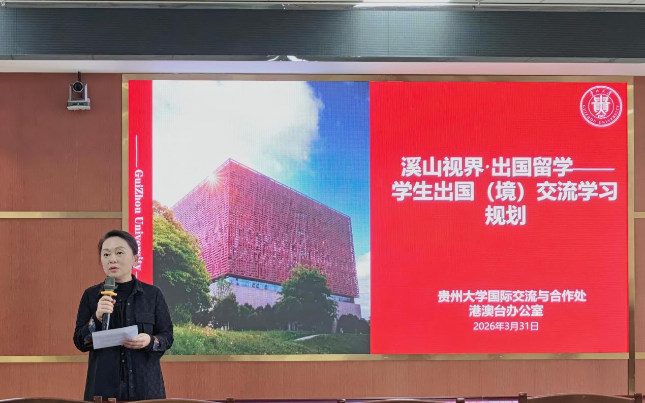 团委网站讯(记者欧云桃报道│摄影欧云桃)2026年3月31日,贵州大学农学院国际化专班(以下简称“专班”)组织开展本科生留学专题培训,特邀请校国际处危杨初夏老师、王炳坤老师担任主讲嘉宾。农学院院长张万萍教授、副院长乙天慈教授出席培训活动,专班班长王勇教授主持本次培训。