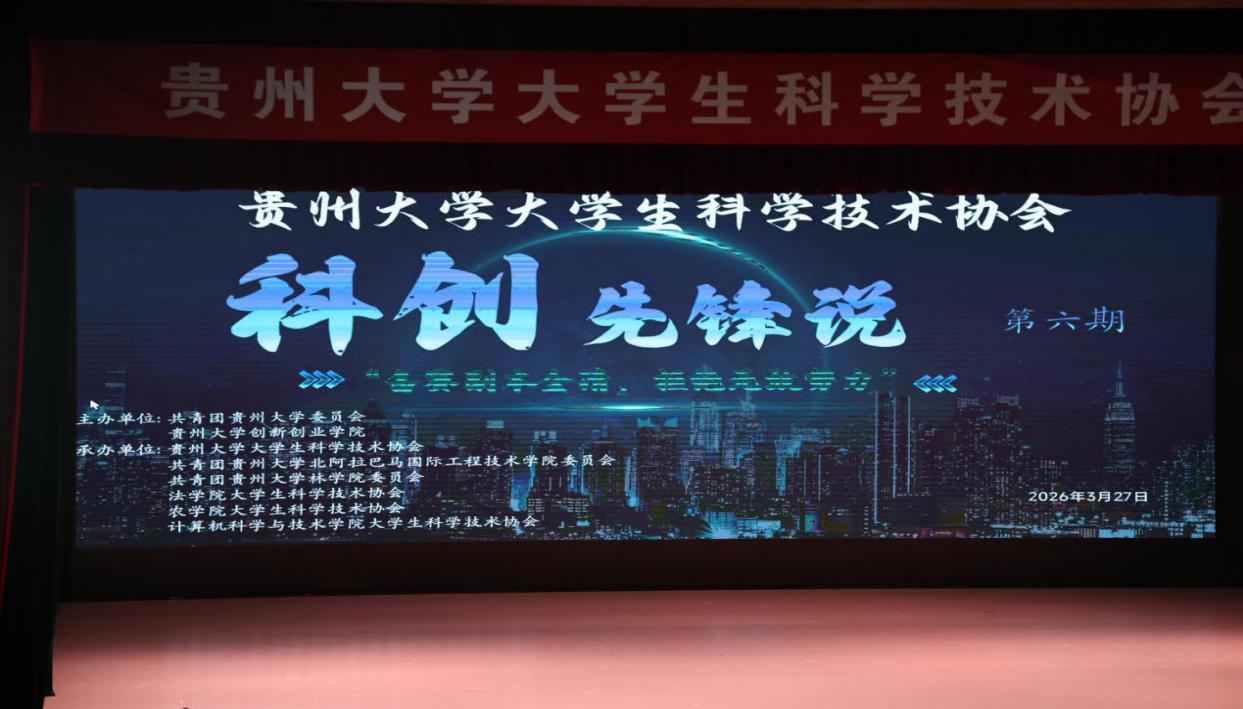 3月27日,贵州大学大学生科学技术协会科创先锋说第六期活动在贵州大学溪山剧场顺利举行。本次活动由共青团贵州大学委员会、贵州大学创新创业学院主办,贵州大学大学生科学技术协会及农学院大学生科学技术协会等多学院科协联合承办。